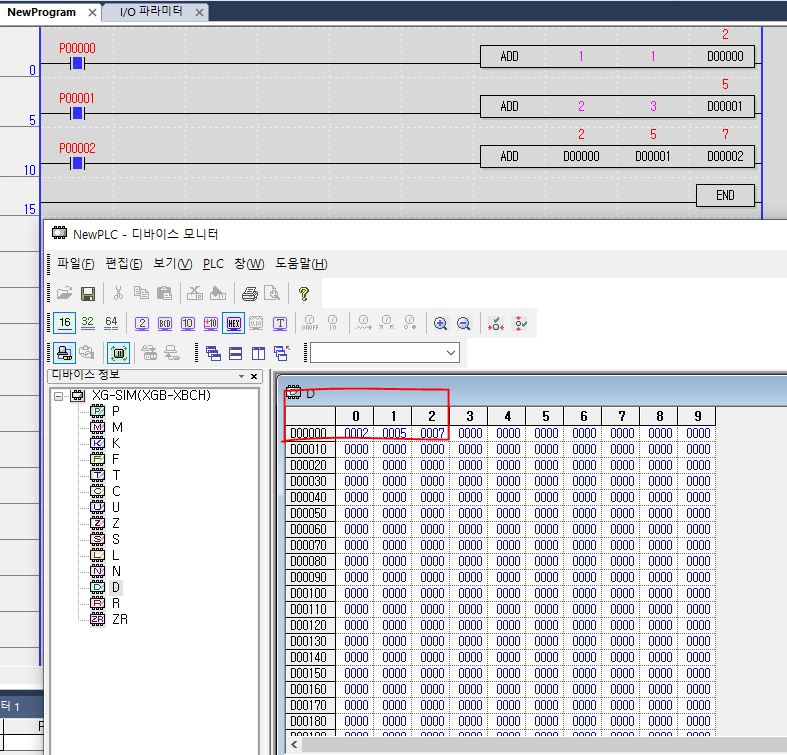 1. 스위치 1 ON시 1, 2 가 더한 값이 D0에 저장된다.