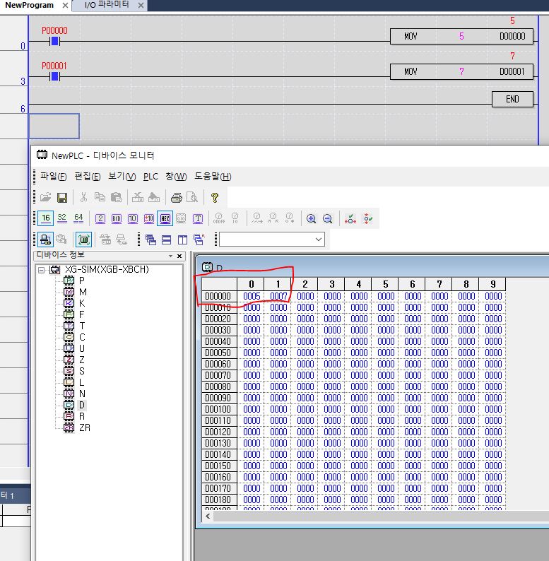 1. 스위치 1을 ON하면 값5가 D0에 저장된다.