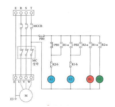 ④ 푸시버튼 스위치 PB2을 누르면 릴레이 R2 여자되고 R2가 여자된 순간 릴레이 R2-a의 접점은 페로되어 자기유지하고 릴레이 R2-a 접점이 페로되어 GL(녹색)램프가 점등되며 R2-b접점을 개로되어 푸시버튼 스위치 PB1를 눌러도 R2-b접점이 열려있어 동작이 안된다.